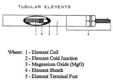 These tubular elements are welded into a flange making an immersion heater assembly. Normally an immersion heater assembly consists of heating elements, flange or tube sheet, thermocouples and its housing and bussing for element circuit (see figure below). To heat a fluid or gas directly, this heater assembly can be bolted into the tank or can be mounted into a pressure vessel.