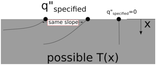 Now, let’s leave a constant temperature boundary condition at x=0: T(x=0)=T0, and apply a constant heat flux boundary condition at x=L: -k(dT/dx)|x=L = q’’ where it is assumed that the value of q’’ is specified. The thermal conductivity of the body is “k”. These boundary conditions result in the temperature distribution: