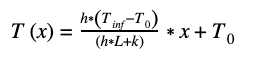Finally, we address the constant temperature condition still on the left side. Here we can impose a convection condition on the right side : -k(dT/dx)|x=L = h*(T(x=L)-Tinf). The temperature at x=L is A*L+T0, so the final temperature distribution is: