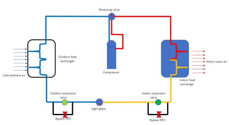 La mayoría de las bombas de calor puede ofrecer opciones de refrigeración y calefacción de espacios gracias a la válvula inversora. En el modo de calefacción, el refrigerante se comprime en el compresor y sale como vapor sobrecalentado a alta presión y temperatura hacia la válvula de inversión. Las válvulas de inversión (ya que ahora funcionan en modo calefacción) dirigirán el refrigerante al intercambiador de calor de la unidad interior. La corriente de aire forzada pasará a través del intercambiador de calor interior, llevándose así parte de ese calor al espacio que se quiere calentar.