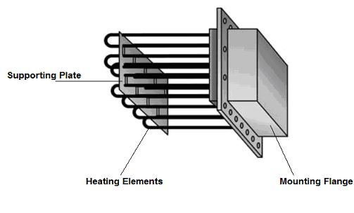 Une charge ohmique peut être générée par la chaleur par convection. Une méthode rentable pour générer ce type de chaleur consiste à utiliser un chauffage à air pulsé, fourni par des aérothermes de conduites. Le chauffe-conduit peut alors être s’utiliser comme banc de charge pour générer des charges fictives pour le générateur d’énergie éolienne. Même si un chauffe-conduit est couramment utilisé pour un conduit d’air, un chauffe-conduit d’air de grande capacité peut toutefois se développer dans un banc de charge de résistances. La conception de base d’un chauffe-conduit à air pulsé se compose de plusieurs tubes d’éléments chauffants pliés fixés à une bride de support (Figure 1).