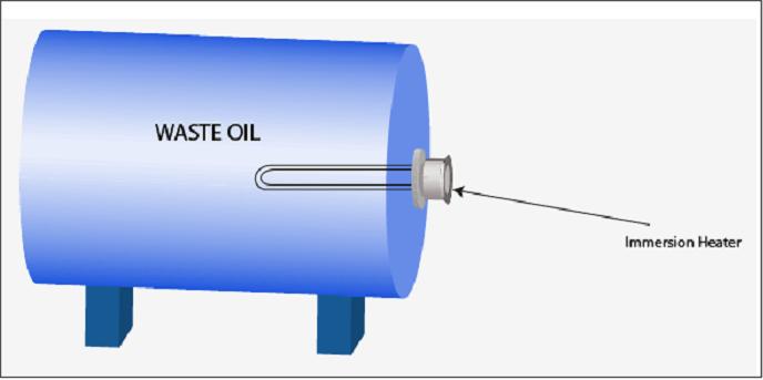 Pour le chauffage de l’huile usée à plus petite échelle, un thermoplongeur à simple bride peut être utilisé pour un réservoir ou une cuve de stockage d’huile. Le processus de chauffage est similaire à celui du réchauffeur à circulation, mais sans l’utilisation d’un coffrage d’acier, le réservoir de stockage contenant l’huile est chauffé directement par le thermoplongeur (voir la figure 3). Le réchauffeur de mazout à immersion se recommande pour le chauffage fixe ou à faible volume d’huile usée.