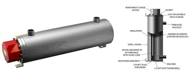 Une chaudière à mazout à circulation se compose d’un carter cylindrique recouvert d’un thermoplongeur à bride et de deux buses d’entrée et de sortie (voir la figure 1). Le fluide d’entrée entre dans le réchauffeur à huile usée via la buse filetée et le liquide est ensuite chauffé par les éléments chauffants avant de sortir dans la canalisation de traitement qui peut être raccordée à la sortie de la chaudière à mazout. L’isolation autour du coffrage d’acier est utilisée pour éviter les pertes de chaleur dans l’environnement ambiant et pour assurer un transfert de chaleur maximal à l’huile en circulation.