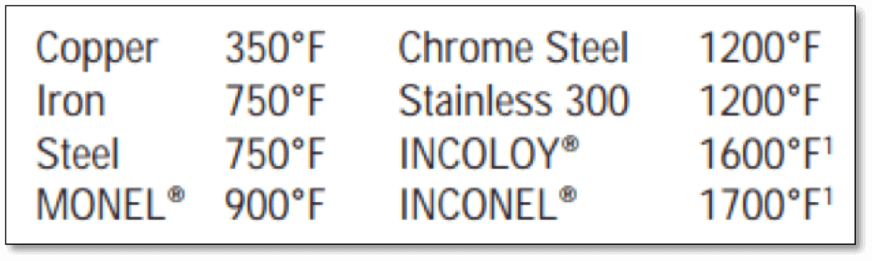 La densité en watts recommandée pour les utilisations dans l’huile est de 20 watts par pouce carré. Cependant, la densité en watts est susceptible de changer en fonction du procédé à chauffer (Cooper, 2015). Si la densité en watts sélectionnée est supérieure à la densité en watts requise, cet effet indésirable comprend la carbonisation et la surchauffe qui peuvent endommager l’élément chauffant et le matériau à chauffer.