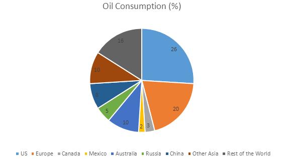 These figures represent a seven year increase of between 5% and 10%. Below is a chart representing oil consumption from around the world, as a percentage of total daily use.